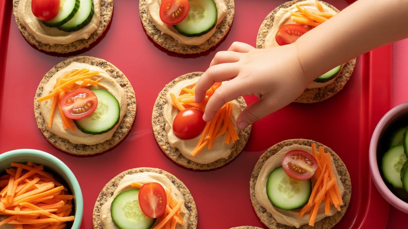 Spread crackers with hummus or yogurt, then let kids decorate them with chopped veggies like a mini pizza.