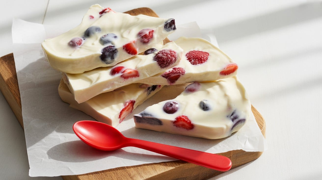 Spread yogurt on a tray lined with parchment, sprinkle with berries, and freeze until firm. Break into pieces and store in freezer.